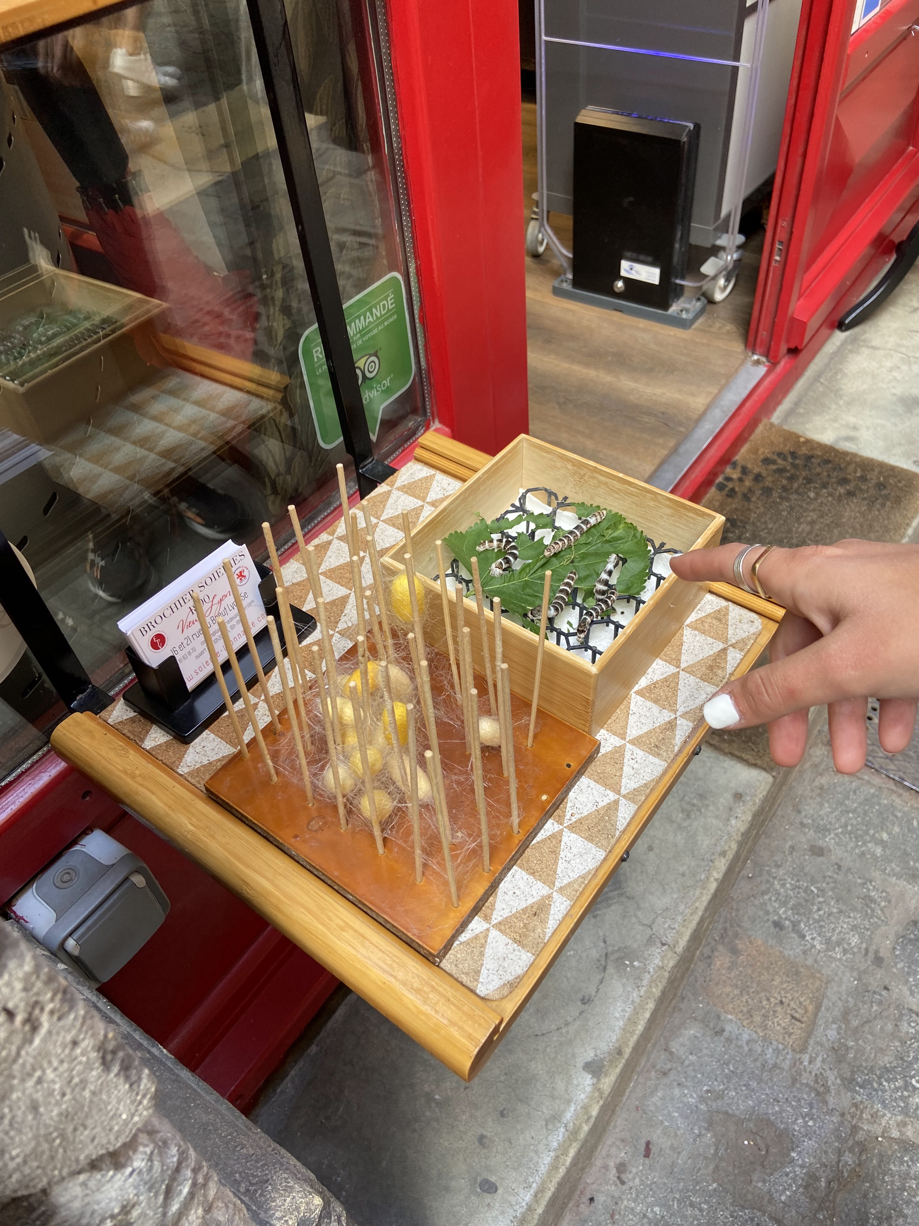Nous sommes tombés sur ce petit bijou absolu en nous promenant dans les rues de la vieille ville. Le propriétaire, M. Brochier, était un homme merveilleux et passionné et il nous a expliqué tous les détails et le processus de création des magnifiques foulards en soie naturelle. Il a montré le cycle de vie des vers à soie vivants depuis leur éclosion jusqu'à la production de leur cocon à l'arrière du magasin. Entreprise familiale de quatre générations transmettant chacune la technique et la passion à la suivante. Ils le font toujours de manière traditionnelle avec un métier à tisser manuel sur place. Il n'en reste plus que quelques-uns à Lyon. Les pièces de velours sont peintes à la main avec des pinceaux. Les pièces sont inestimables et les foulards que nous avons ramenés à la maison sont magnifiques. C'est mon meilleur souvenir de Lyon.